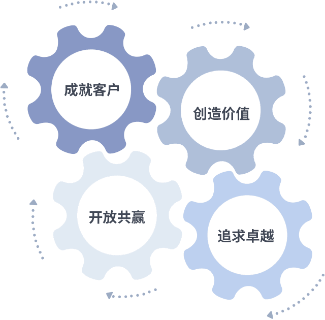 成就客户是一切决策的出发点,,创造价值是衡量所有工作的标准,,,,追求卓越是我们做事做人的态度,,开放共赢是我们的格局也是最终的结果。。。价值观的齿轮环环相扣,,,,推动着组织里的每个人不断向前。。。